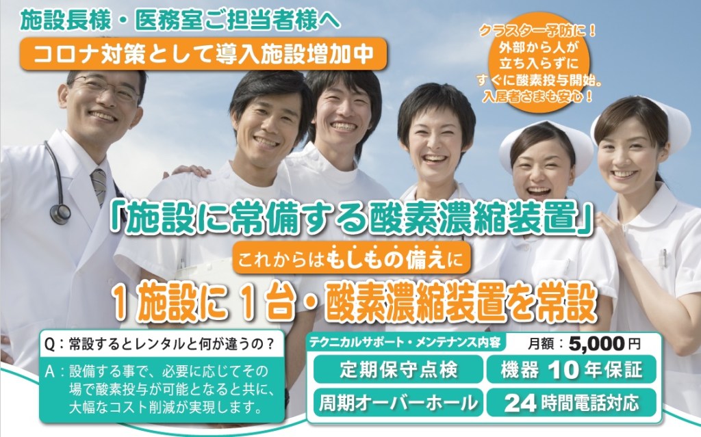 施設の常設機器としての酸素濃縮装置には、コスト削減の観点から「リース導入」がおすすめです。