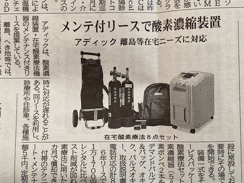 2021年3月12日付 北海道医療新聞に、弊社が北海道地区代理店として取り扱いを行っている酸素濃縮器メンテナンスリースについてご紹介いただきました。(株)アディックと(有)セイコーメディカルでは、都市部から離れた遠隔地でも、酸素が必要な時に医療従事スタッフ、患者様、ご家族様をお待たせすることなく、即応できる体制を提案いたします。大幅なコスト削減も実現するプランにご着目ください。